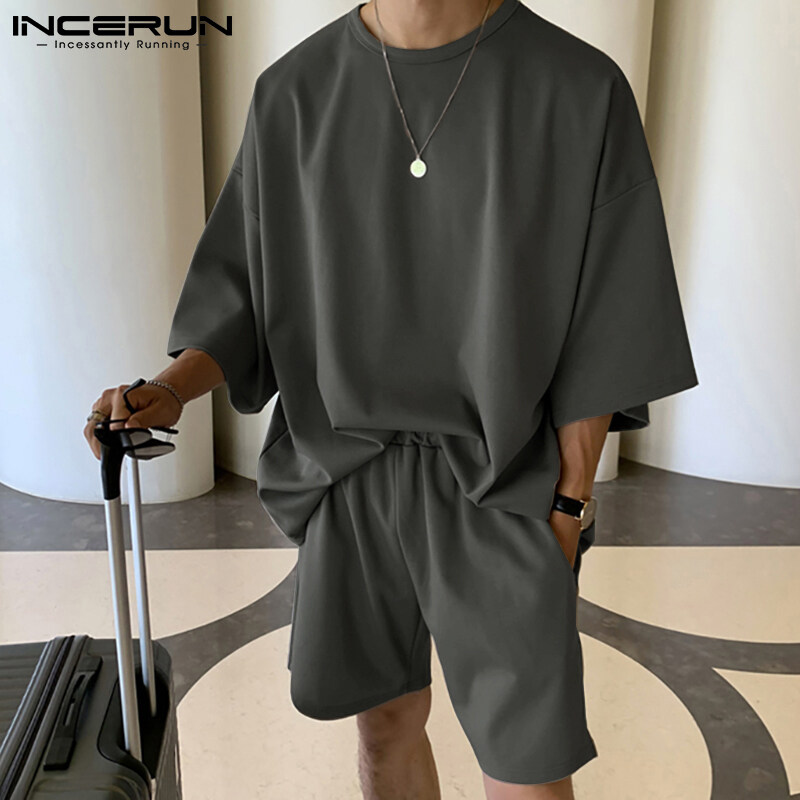 INCERUN Mens Shorty Pajamas Sets Nightwear Japanese Loose Fit Tops Shorts Sleepwear Suit (Korean Style)