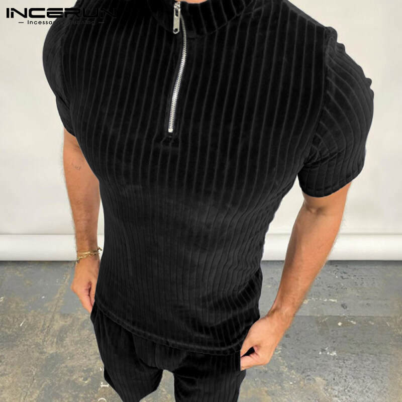 Beehoo INCERUN Mens Short Sleeve Zip Up Sets Shorts Suits Fit Sleepwear Underwear(Western Style)